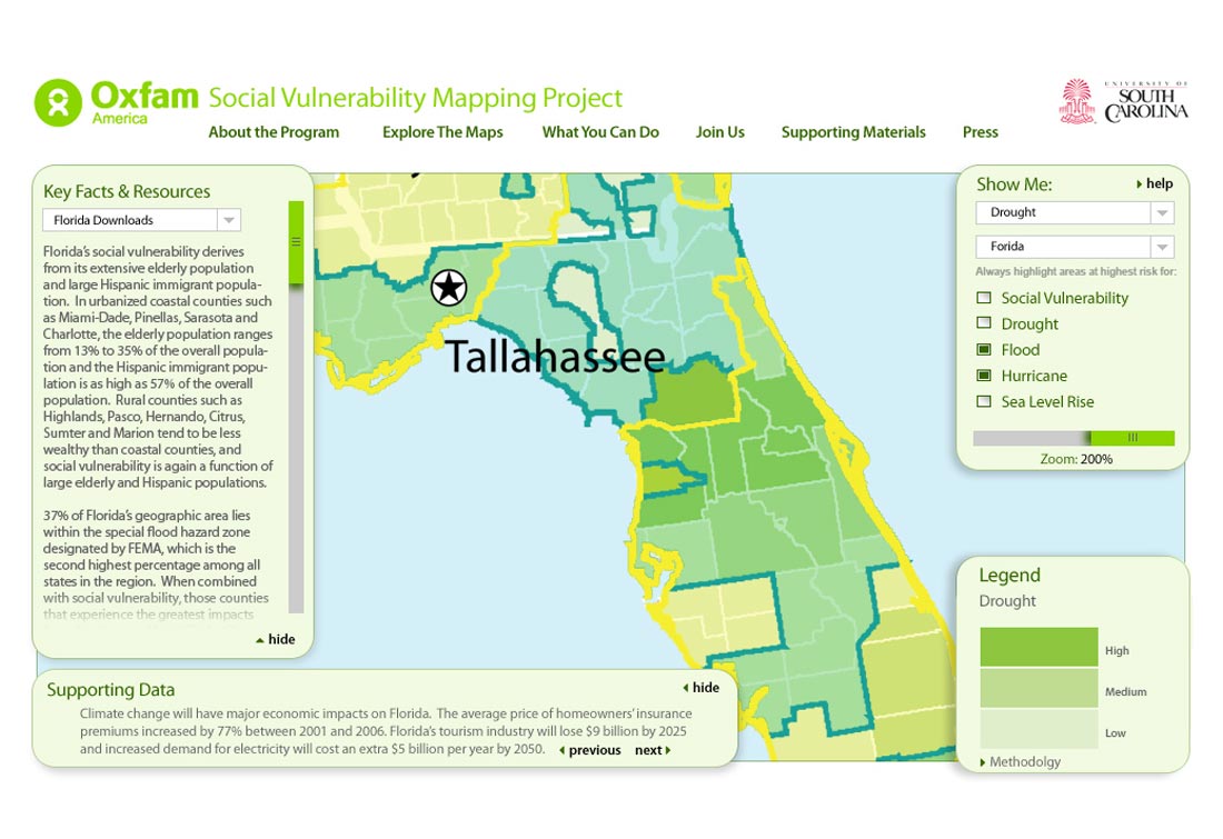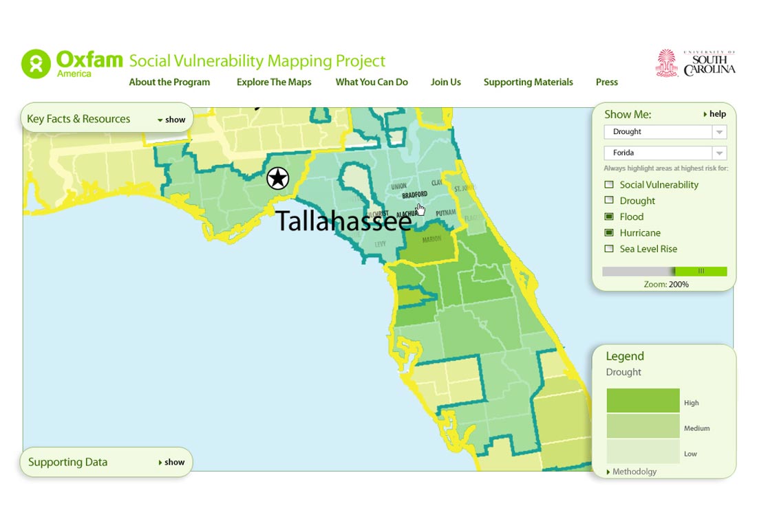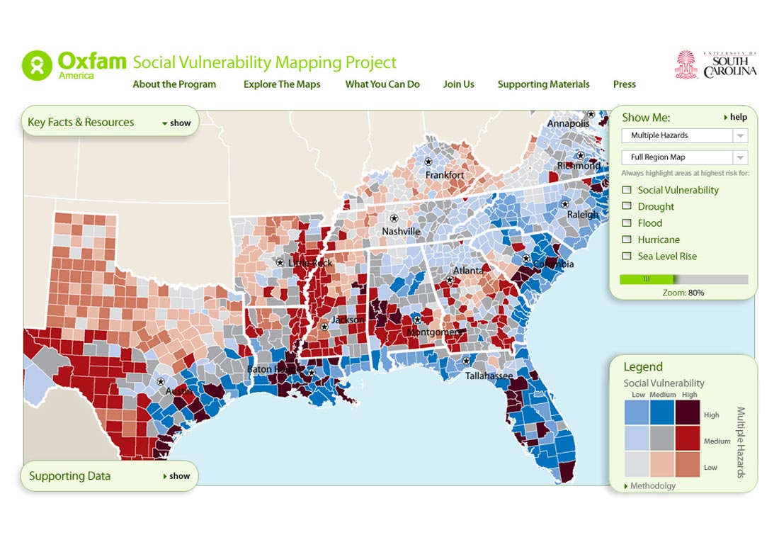 From the client: "This research, commissioned by Oxfam America, includes a series of layered maps that depict social and climate change-related hazard vulnerability. The maps assist in identifying hotspots in the Southeastern United States that are at significant risk in the face of four particular climate change-related hazards: drought, flooding, hurricane-force winds, and sea level rise. The specific region of focus is the 12-state area encompassing AL, AR, FL, GA, KY, LA, MD, MI, VA, SC, TN, and TX."